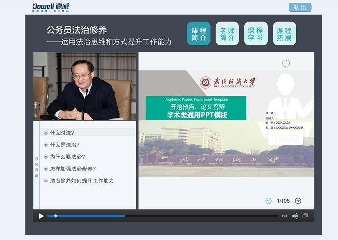 ? 這是一種近年來越來越流行的網(wǎng)絡(luò)課件格式,它由視頻、課程索引、課程文本圖片內(nèi)容構(gòu)成。課程目錄和課程內(nèi)容顯示的很清晰;視頻,課件目錄布局也很合理,便于學(xué)員操作和觀看,視頻中的講課內(nèi)容跟右側(cè)課件內(nèi)容是實時同步的。觀看課程時,可以多種方式進(jìn)行進(jìn)度控制以及播放速度調(diào)整。
